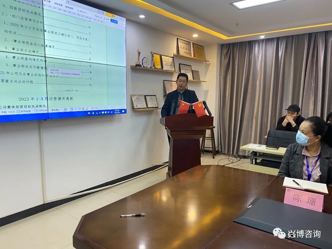 抓住机遇 迎接挑战 兴博第一季度工作会圆满举办4月28日上午,在兴博公司会议室举办了兴博2023年第一季度工作会议,会议由常务副总彭国昌主持。 会议开篇由副总经理韩滢对公司整体运营情况进行了回顾和总结,总体运行趋稳。接着各事业部负责人对第一季度的工作重点剖析了存在的问题和采取的积极措施,并对第二季度工作计划进行了统一筹划,有序安排。 会议上,各职能部门对行政、人资、运营、项目管理等方面有关制度进行了宣贯。 会议最后由董事长周勇进行了会议总结并对第一季度表现优异部门及个人给予表彰。 此次工作会议既总结了工作、交流了经验、找到了差距,又统一了认识、明确了目标、坚定了信心。希望大家不断进取改善,为公司取得更好更多的成绩。周勇董事长动员公司员工抓住机遇,迎接挑战,稳中求进,齐心发展,创造出更优秀的成绩。 |