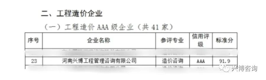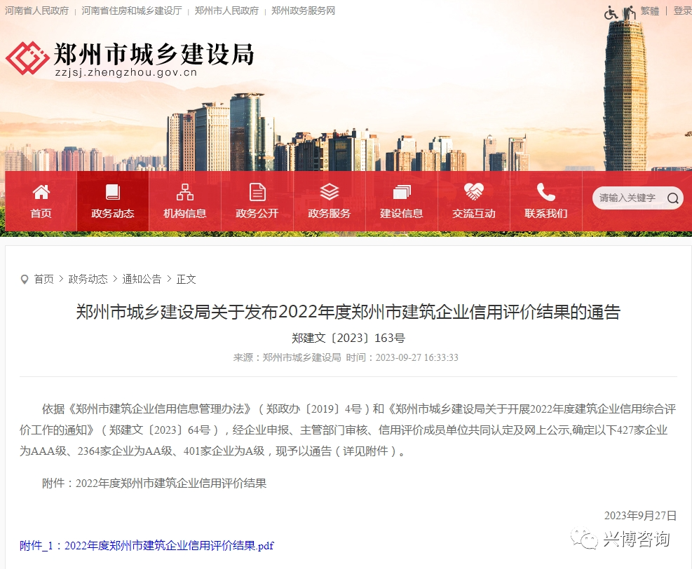 2023年9月27日,郑州市城乡建设局发布2022年度郑州市建筑企业信用评价结果的通告,兴博咨询荣获“工程造价AAA级企业”等级。