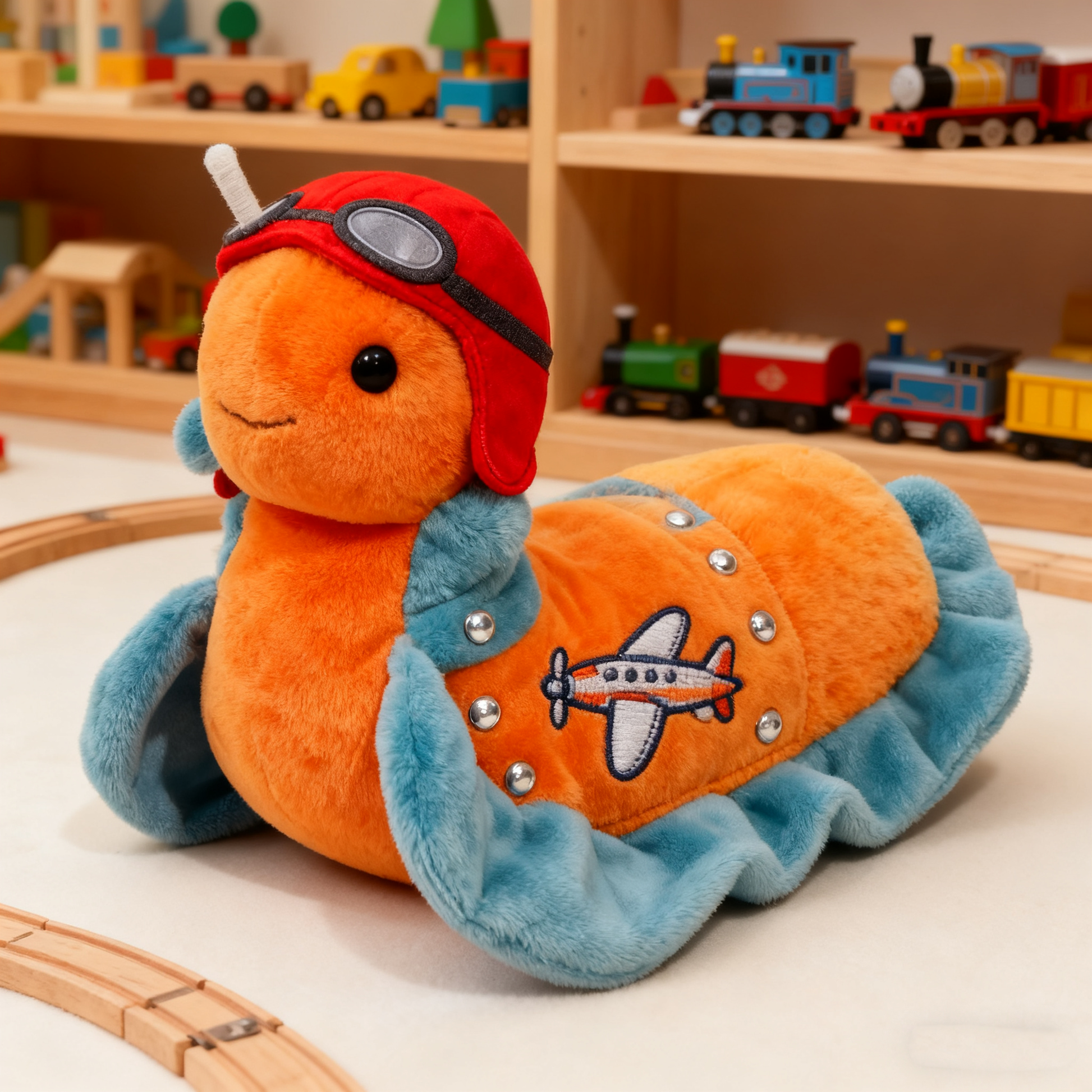 Lavern is a quirky, fluffy slug who always moves at a leisurely pace! She loves to stroll along, nibbling on plants and leaves as she goes. Her orange and blue hues give her a refined and elegant air, while the soft, fluffy fabric on her sides undulates like waves, making her appear to be dancing. A pair of sparkling blue eyes perched on long eyestalks further accentuate Lavern's adorable yet whimsical expression. Having Lavern as a fluffy slug friend will make it easier to remember to slow down and enjoy the little things in life!