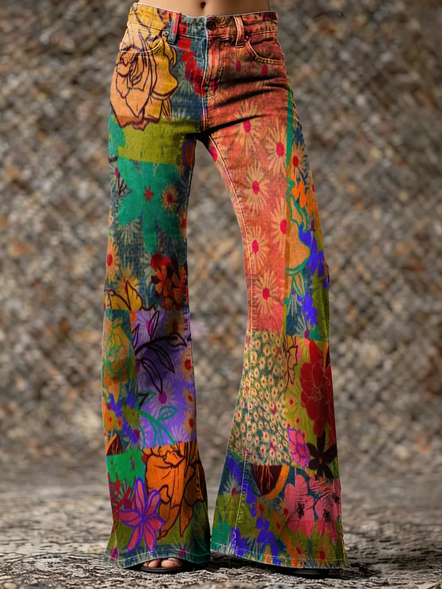 Women's Bohemian Floral Patchwork Art Print Washed Cotton Jeans