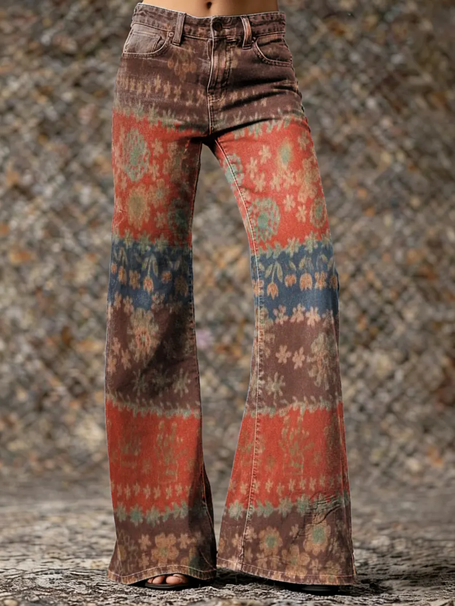 Women's Bohemian Floral Patchwork Art Print Washed Cotton Jeans