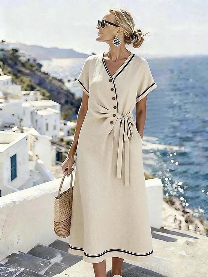 Women'S Casual V-Neck Pleated Tie-Waist Dress