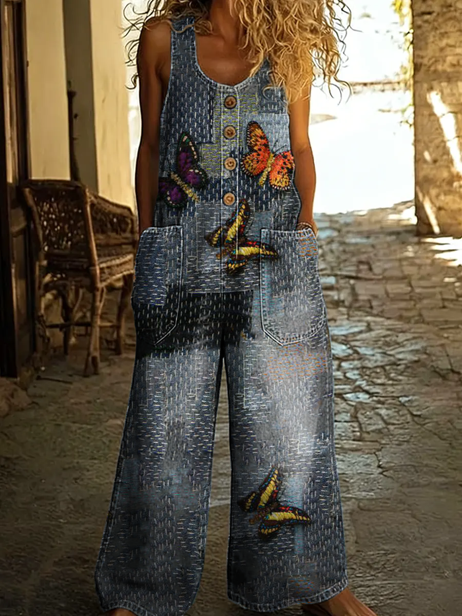 Women's Retro Butterfly Art Print Casual Sleeveless Washed Cotton Jumpsuit