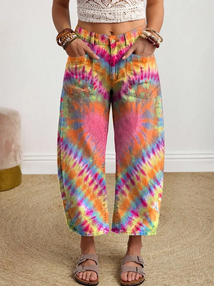 Women's Retro Colorful Heart Tie-Dye Art Print Casual Pocket Cotton Pants