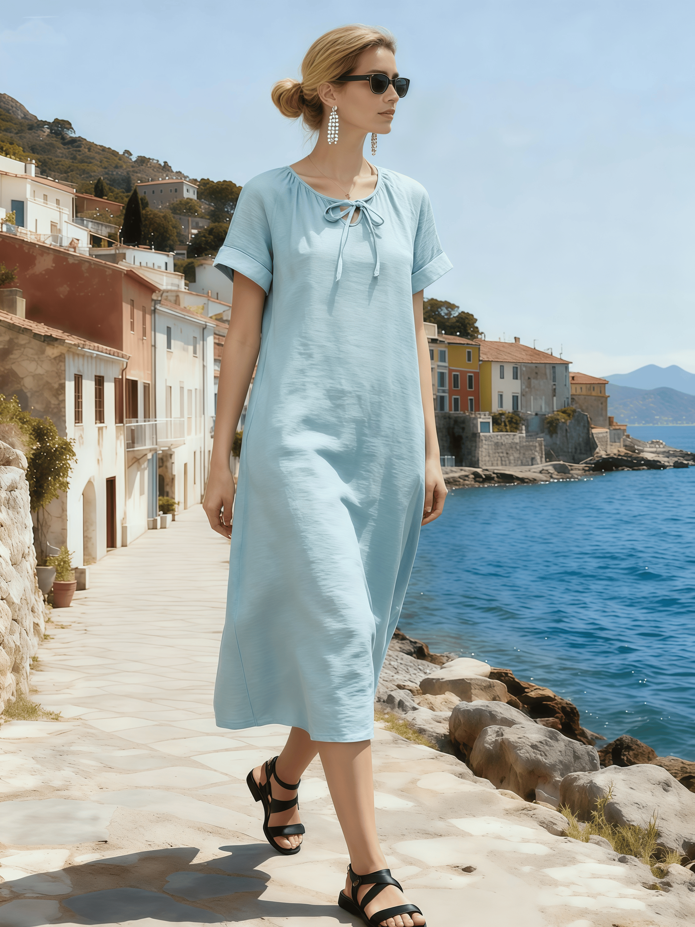 Women's Round Neck, Tie-Waist, Casual Short-Sleeved Dress