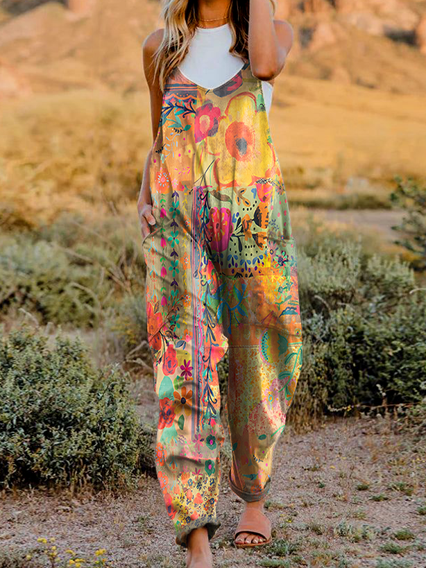 Women's Vintage Ethnic Boho Floral Art Print Casual Pocket Jumpsuit