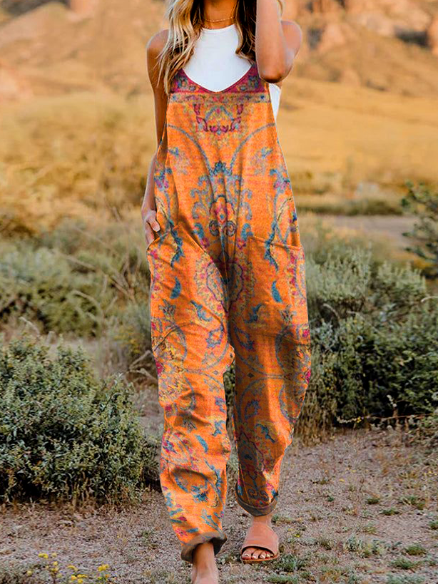 Women's Vintage Ethnic Orange Floral Art Print Casual Pocket Jumpsuit