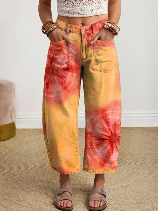 Women's Vintage-style Textured Floral Art Print Casual Cotton Trousers With Pockets.